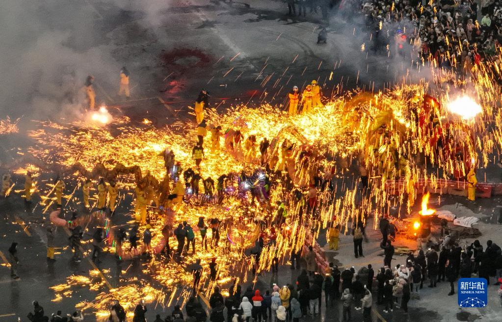 2月5日,在貴州省遵義市新蒲新區新蒲街道中橋村,人們在鐵花中舞龍(無人機照片)。