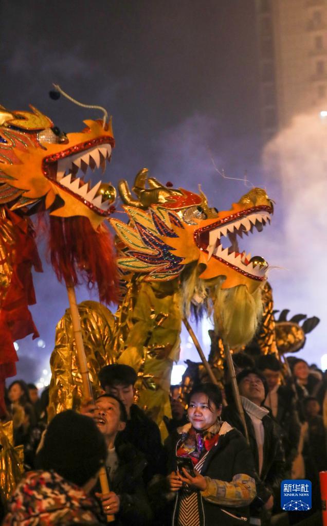 2月5日晚,人們?cè)谫F州省玉屏侗族自治縣舞陽(yáng)廣場(chǎng)舞龍。
