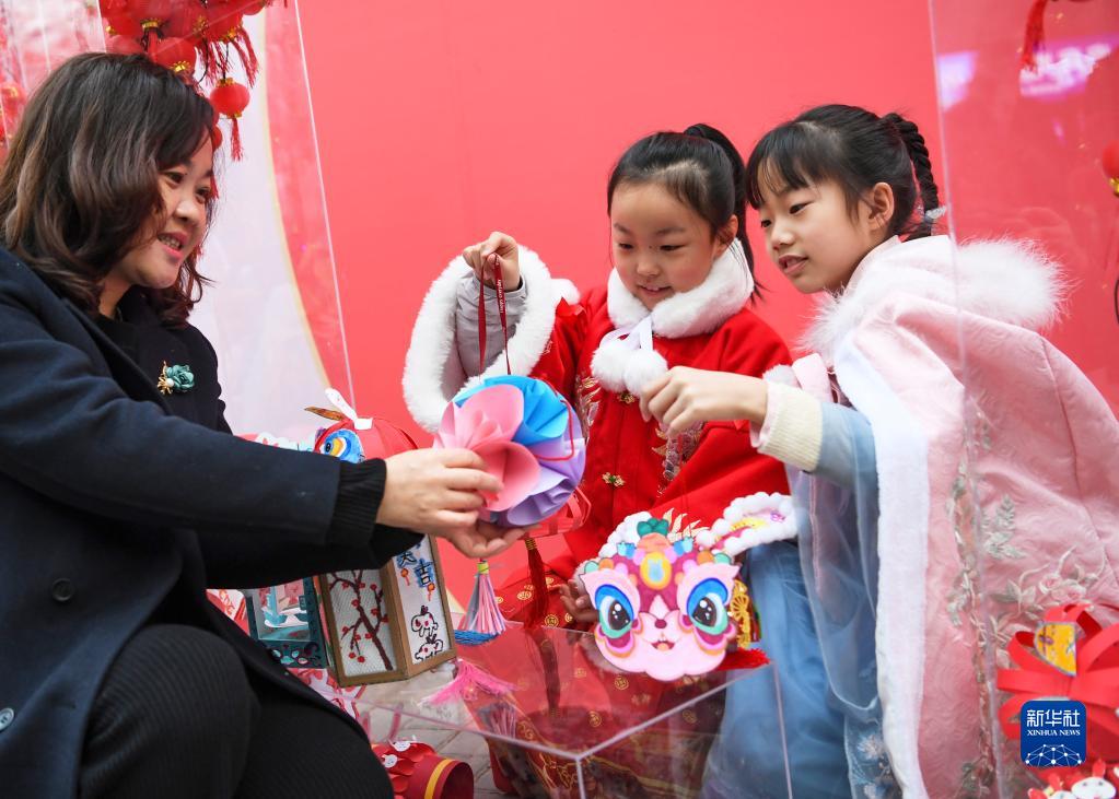 2月6日,在西安市新城區后宰門小學,教師代菲和學生體驗漢服合影活動。