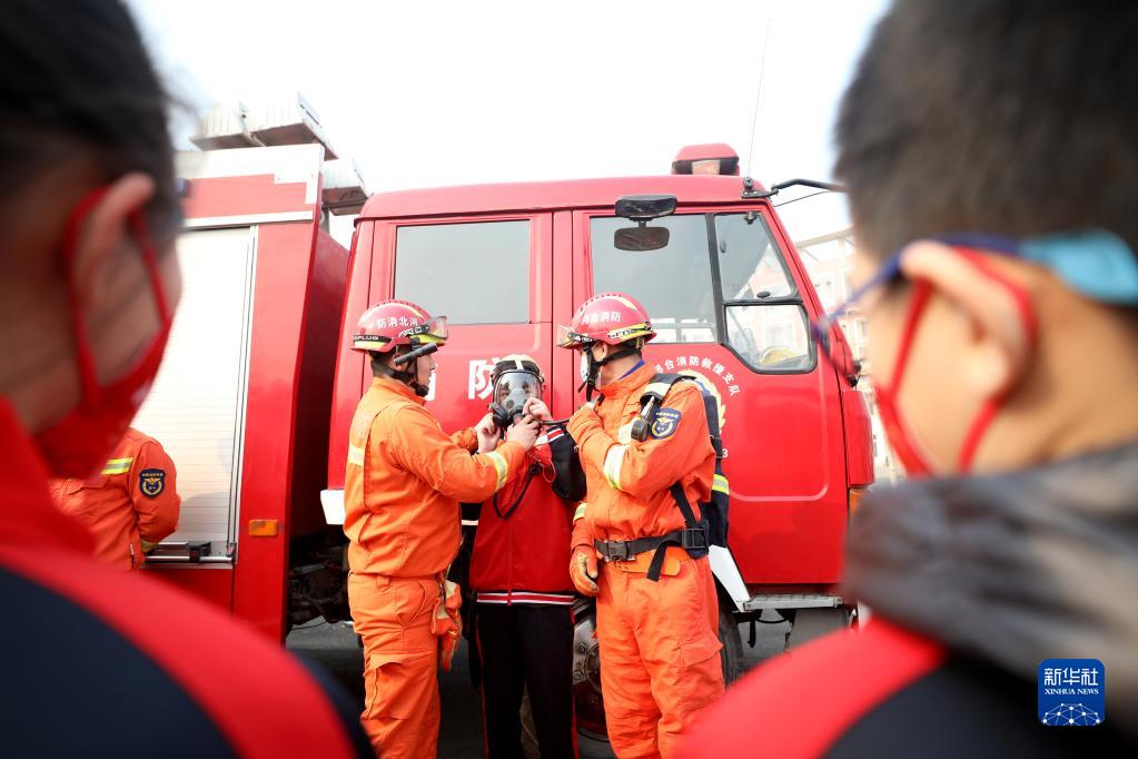2月6日,在隆堯縣第二實驗小學,學生在消防員指導下體驗正壓式空氣呼吸器。