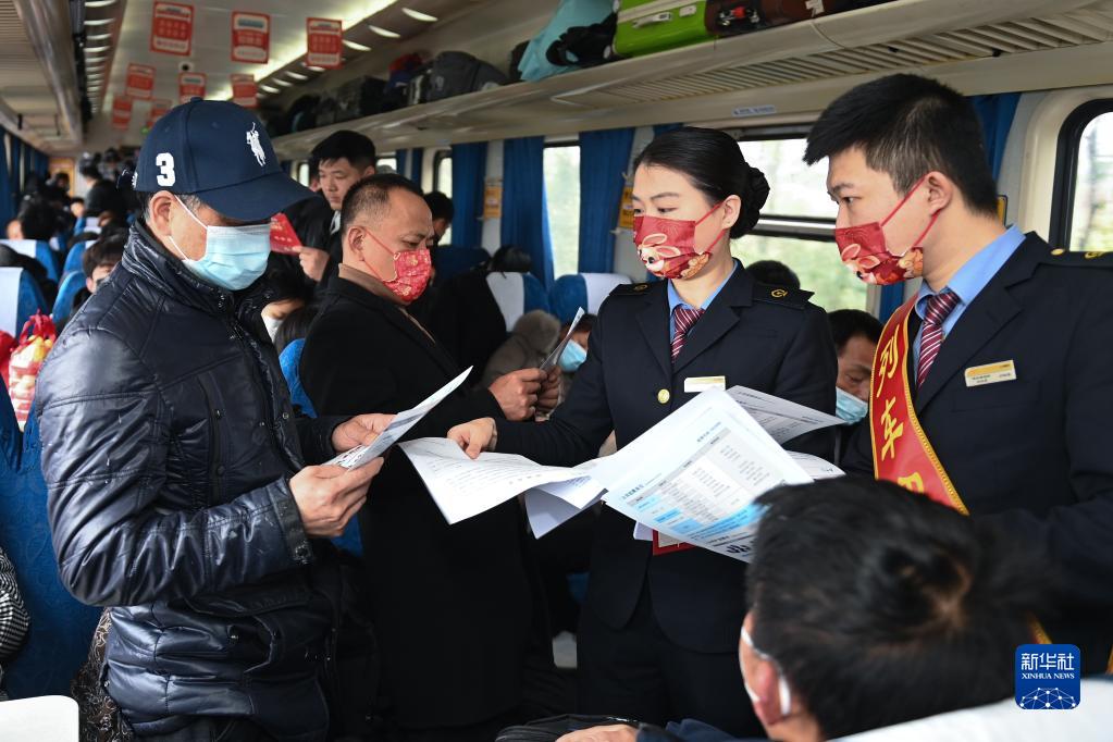 2月6日,在K210次列車上,杭州客運段乘務人員向旅客發放參與現場招聘的崗位信息。