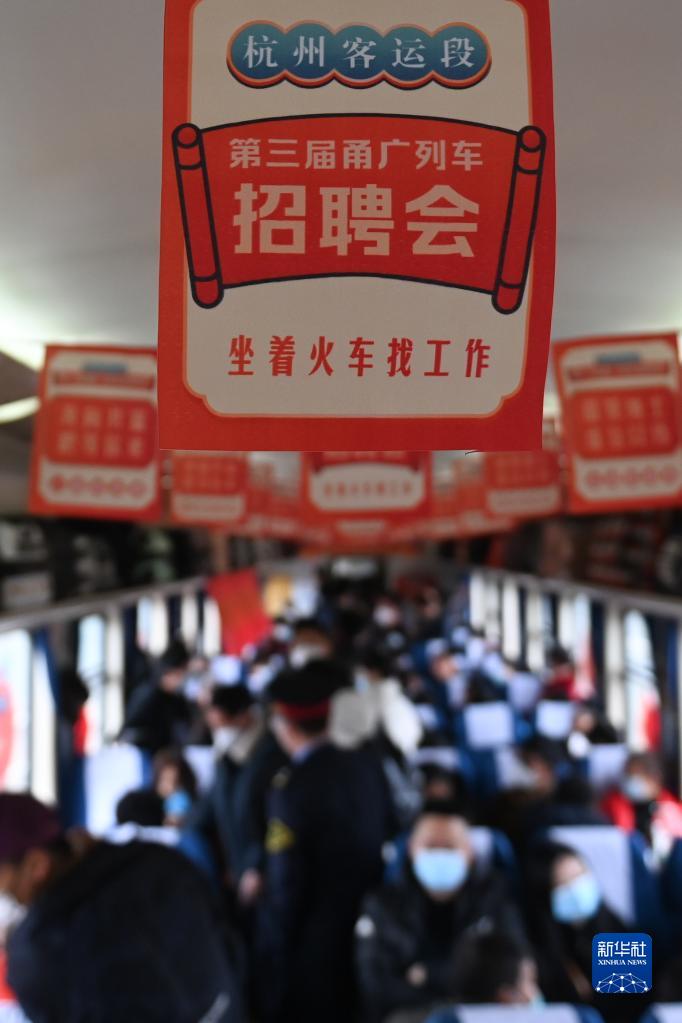 當(dāng)日,中國鐵路上海局集團(tuán)有限公司杭州客運(yùn)段第三屆列車招聘會(huì)在由廣州開往寧波的K210次列車上舉行,來自浙江的10家企業(yè)代表受邀來到列車上,與旅客面對面,為旅客提供暖心的就業(yè)服務(wù)。