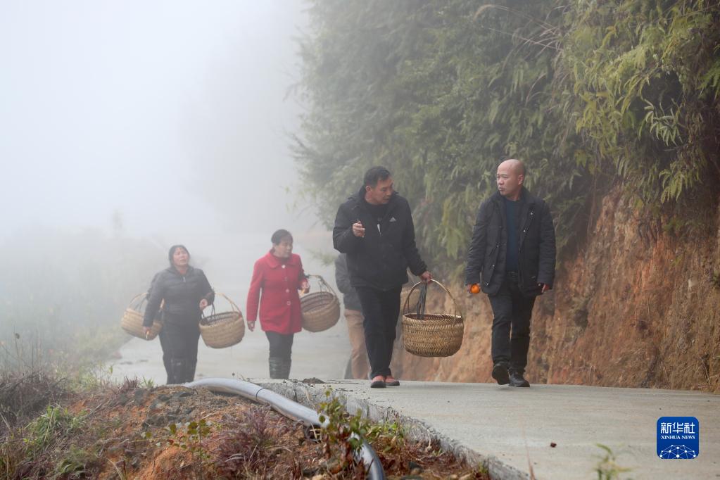 在福斗村大森林碩豐農(nóng)業(yè)高山水果基地,返鄉(xiāng)創(chuàng)業(yè)種植高山水果的村民陳繩春(右一)帶領(lǐng)工人采收沃柑(2月5日攝)。