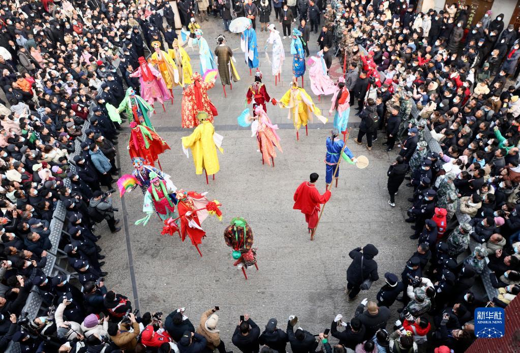 2月6日,社火團(tuán)隊(duì)的演員在廟會上表演。