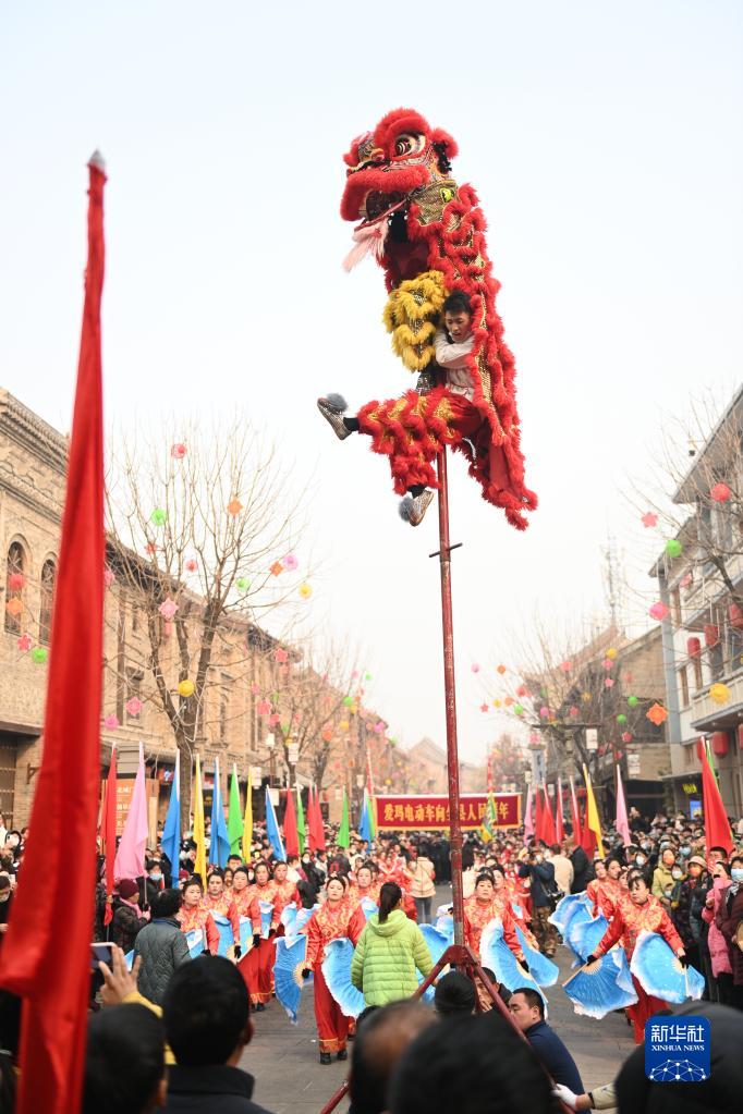 當日是農(nóng)歷正月十六,在河南省浚縣舉行的正月古廟會上,幾十支社火團隊輪番表演,踩高蹺、扭秧歌、耍獅子,鑼鼓喧天,熱鬧非凡,形成一道富有特色的中原文化景觀。河南省浚縣的正月古廟會已有1600多年歷史,有“華北第一廟會”之稱,被譽為民俗文化的“活化石”,是中國民間文化保護工程項目、國家級非物質(zhì)文化遺產(chǎn)。