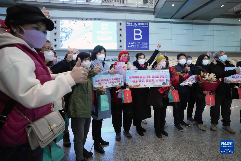 2月6日,內地與港澳人員往來全面恢復后,香港赴北京首個旅游團的游客在首都國際機場合影留念。