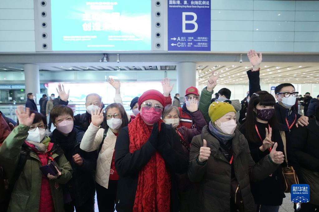 2月6日,內地與港澳人員往來全面恢復后,香港赴北京首個旅游團的游客在首都國際機場參加歡迎儀式。