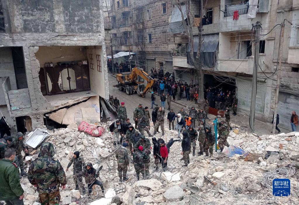2月6日,人們在敘利亞阿勒頗省一處倒塌的建筑現場進行救援。