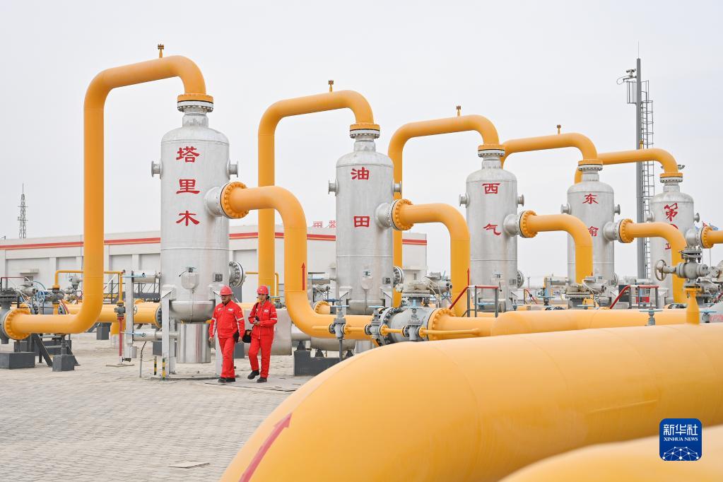 2月6日,輸氣工在塔里木油田西氣東輸?shù)谝徽狙b置區(qū)進(jìn)行巡檢。