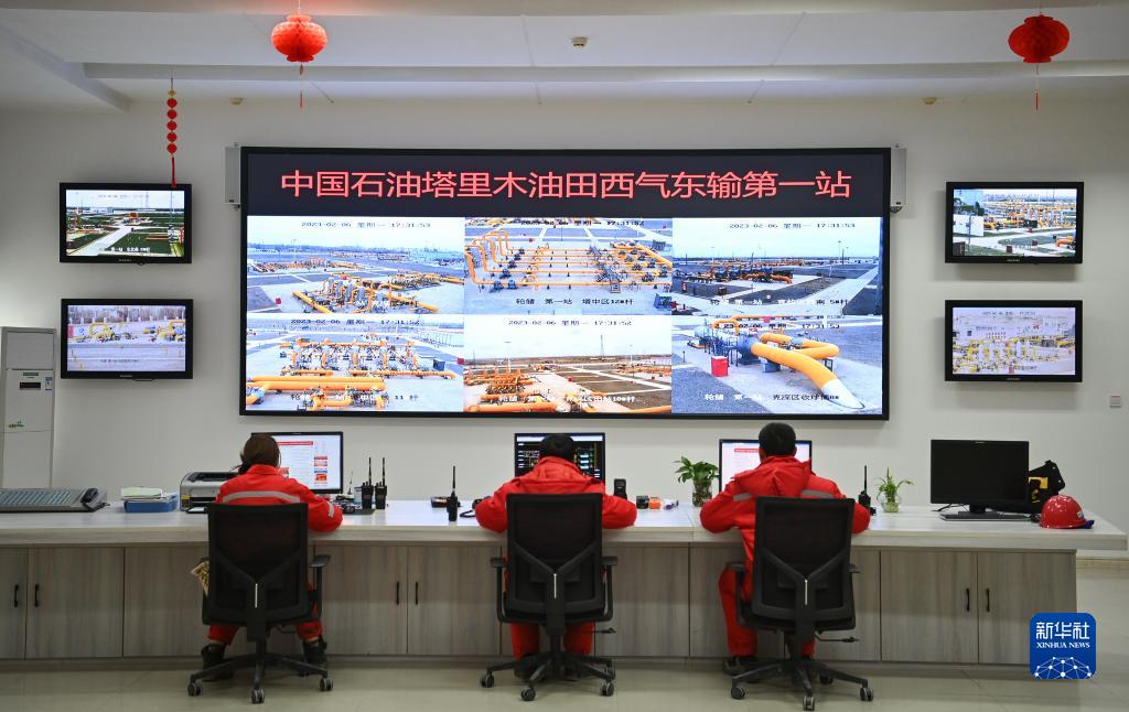 2月6日,工作人員在塔里木油田西氣東輸第一站站控室內監控管線運行參數。