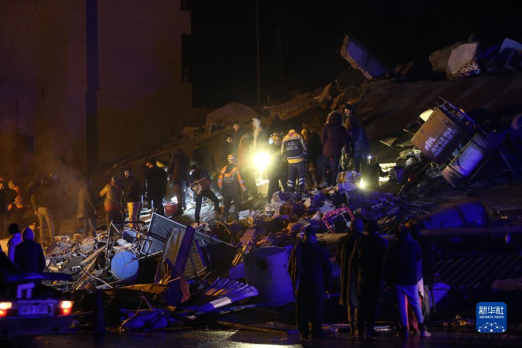2月6日,救援人員在土耳其南部地震重災區卡赫拉曼馬拉什省帕扎爾哲克倒塌的建筑中搜尋幸存者。