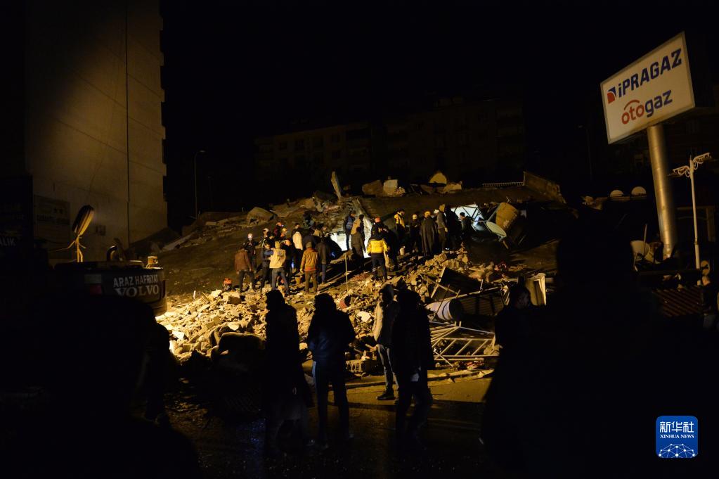 2月6日,救援人員在土耳其南部地震重災區卡赫拉曼馬拉什省帕扎爾哲克倒塌的建筑中搜尋幸存者。