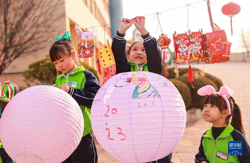 2月7日,山東省榮成市蜊江小學的學生懸掛燈籠迎接新學期。