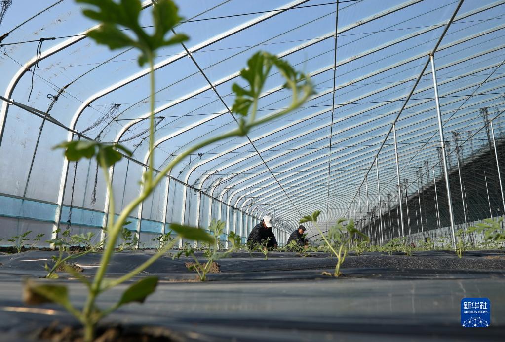 2月7日,河北省灤州市灤城街道楊家院村的農(nóng)民在大棚內(nèi)管護(hù)西瓜秧苗。