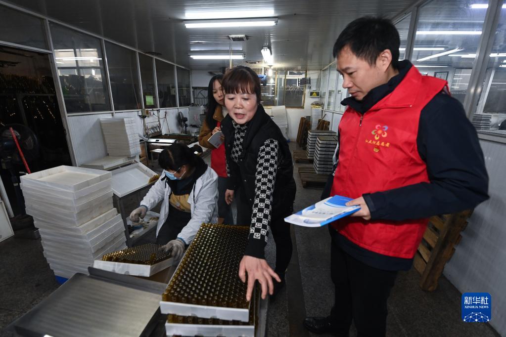 2月7日,在杭州市臨安區(qū)太陽鎮(zhèn)的一家玻璃制品企業(yè)車間內(nèi),黨員助企服務小分隊的志愿者向企業(yè)負責人(右二)了解企業(yè)目前遇到的實際困難。