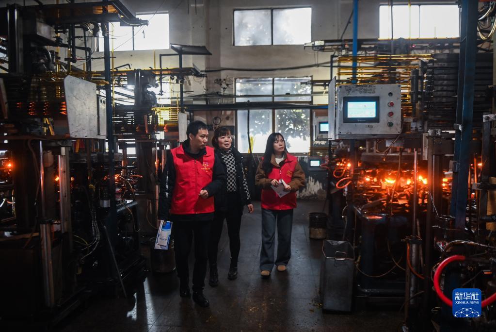 2月7日,在杭州市臨安區太陽鎮的一家玻璃制品企業車間內,黨員助企服務小分隊的志愿者向企業負責人(中)了解企業目前遇到的實際困難。