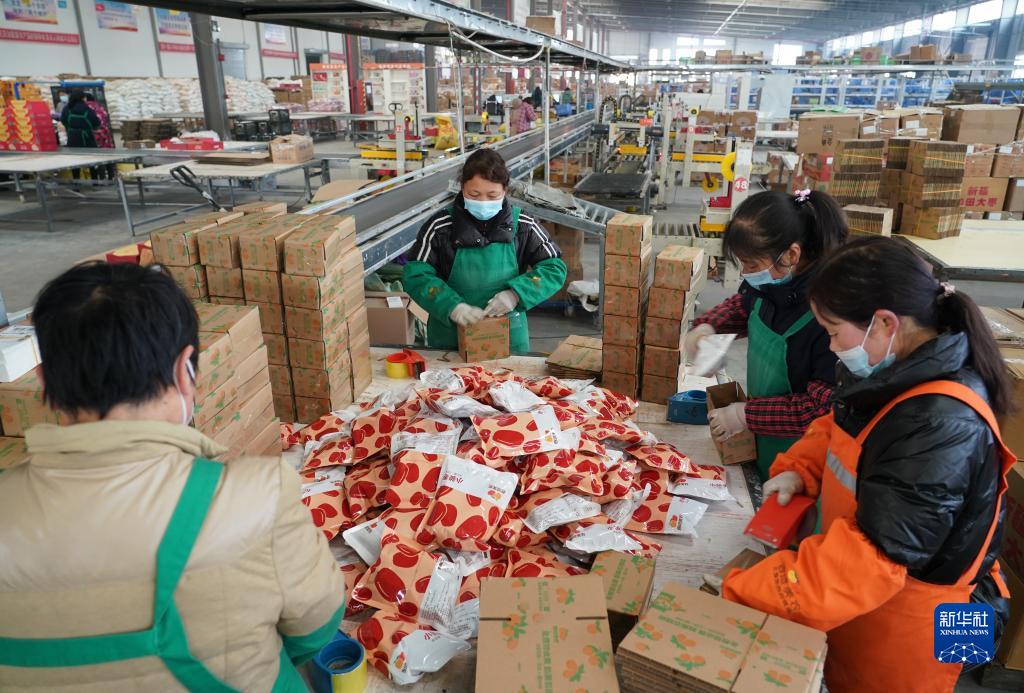 2月6日,在位于武功縣的陜西美農網絡科技有限公司物流倉,工作人員在打包食品快遞包裹。