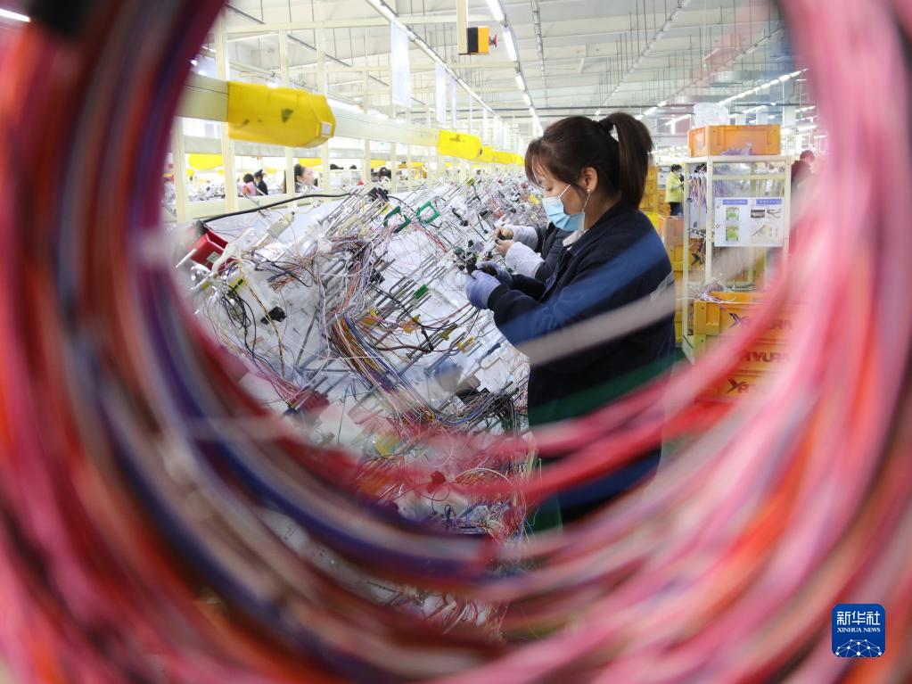 2月7日,工人在山東省菏澤市牡丹區王浩屯鎮一家企業加工車用線束。