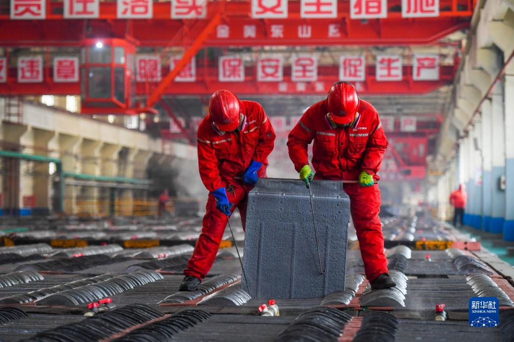 2月7日,工人在內蒙古赤峰市巴林左旗的赤峰山金銀鉛有限公司生產車間檢查鉛板電解情況。