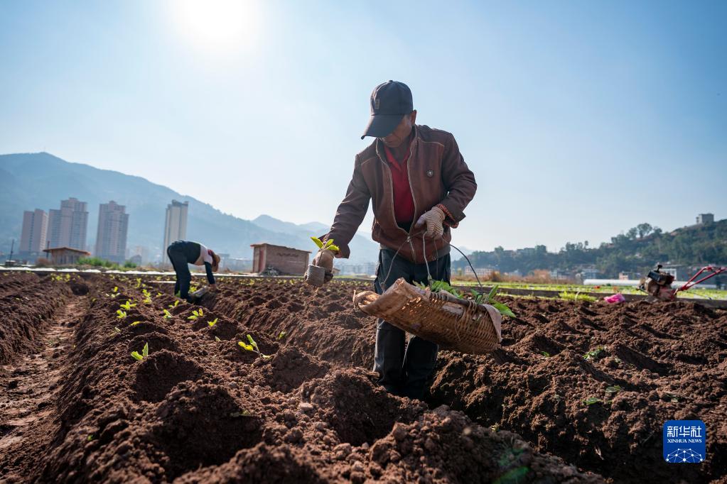 2月7日,在云南省大理白族自治州南澗彝族自治縣楊免莊村,農民在田間種植蔬菜苗。