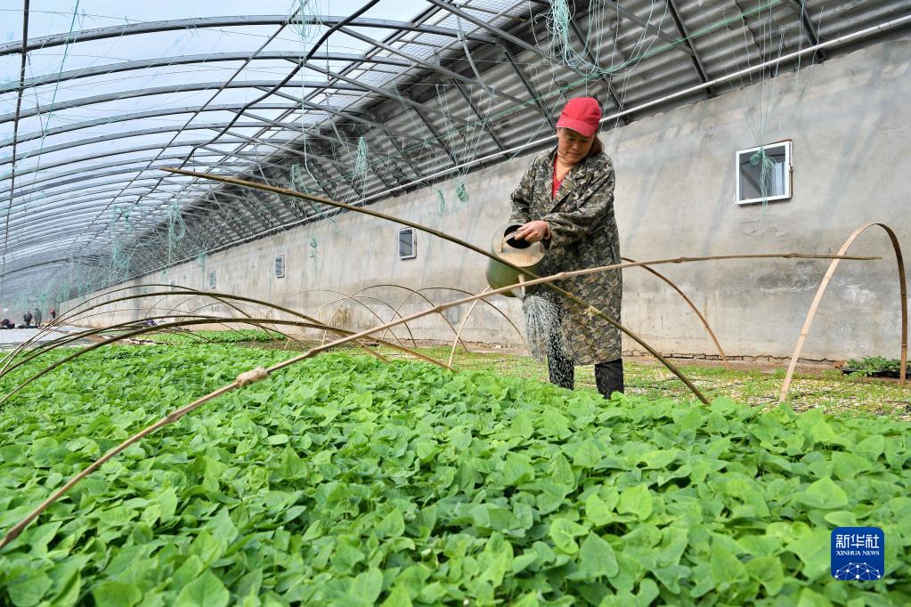 2月7日,在湖北省襄陽市保康縣寺坪鎮庹家坪村蔬菜種植基地育苗大棚,村民為蔬菜秧苗噴水。