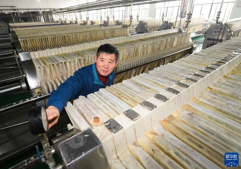 2月7日,在位于紹興市越城區(qū)的古越龍山釀酒一廠,釀酒師宋星雷在壓榨車間查看進(jìn)料管壓力。新華社記者 翁忻旸 攝