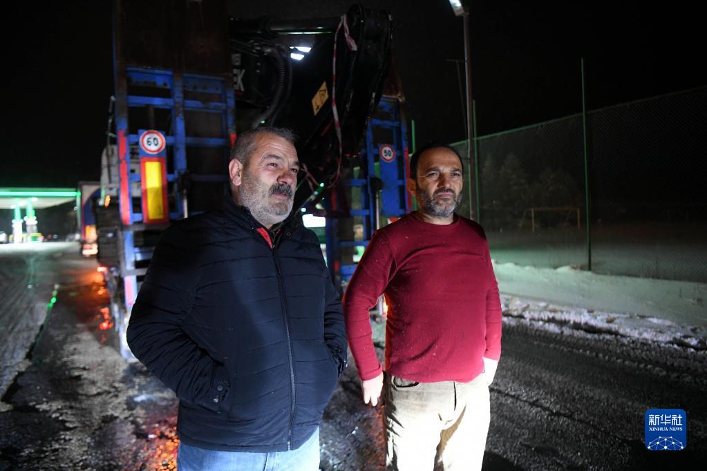 2月6日晚,在土耳其伊斯坦布爾至安卡拉公路上,貨車司機(jī)艾哈邁德·莫里斯(右)告訴記者,他駕駛重型挖土機(jī)前往災(zāi)區(qū)加濟(jì)安泰普省,將參與當(dāng)?shù)鼐仍ぷ鳌?/p>