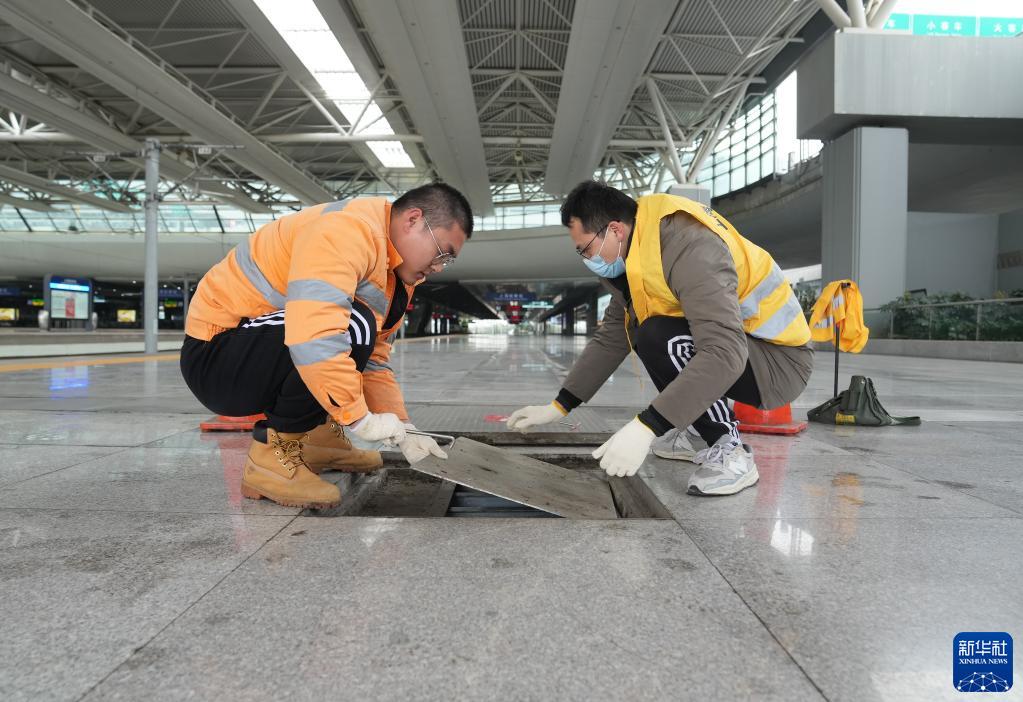 2月7日,在上海虹橋火車站,上海房建公寓段工作人員準備對站臺的地下式消火栓進行檢修。