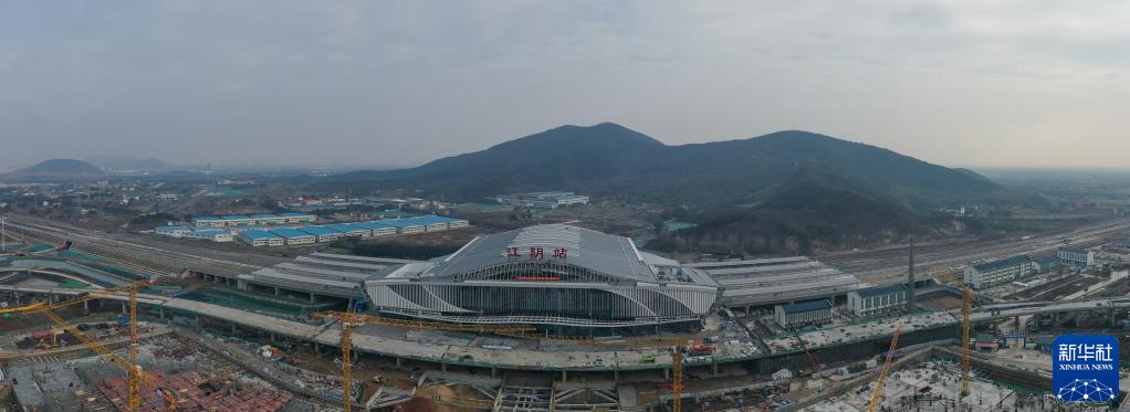 2月7日拍攝的江蘇南沿江鐵路江陰站站房(無(wú)人機(jī)照片)。