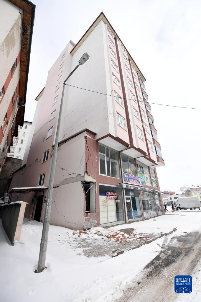這是2月7日在土耳其卡赫拉曼馬拉什省的埃爾比斯坦地區拍攝的地震中受損的建筑物。