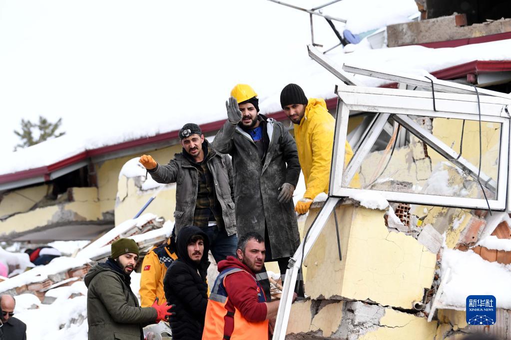 2月7日,人們在土耳其卡赫拉曼馬拉什省的埃爾比斯坦地區展開救援工作。