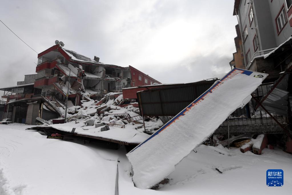 這是2月7日在土耳其卡赫拉曼馬拉什省南部的埃爾比斯坦地區(qū)拍攝的地震中受損的建筑物。