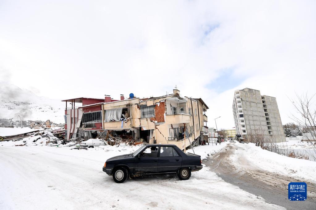2月7日,在土耳其卡赫拉曼馬拉什省的埃爾比斯坦地區,一輛汽車經過地震中受損的建筑物。