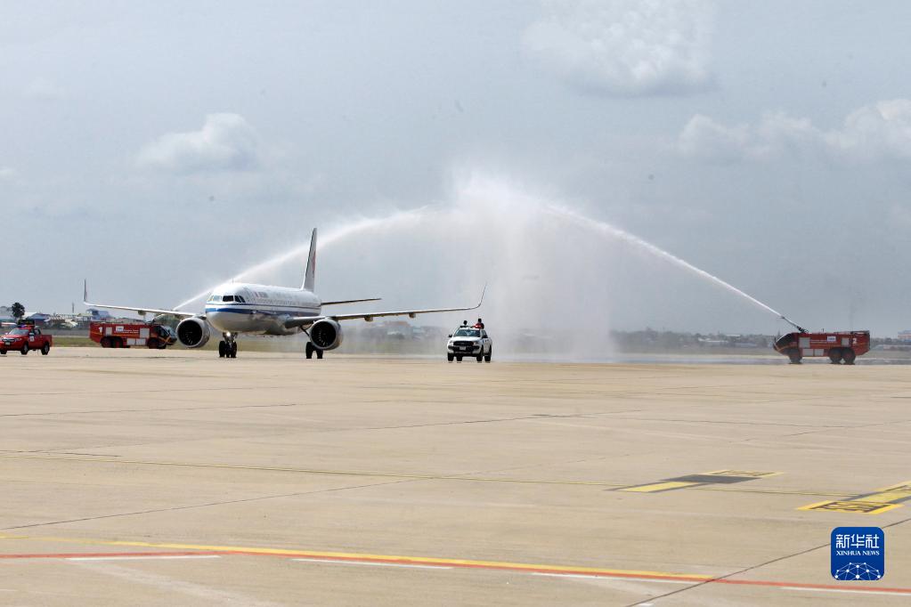 2月7日,國(guó)航航班在柬埔寨首都金邊國(guó)際機(jī)場(chǎng)接受水門(mén)禮。