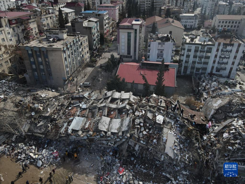 這是2月7日在土耳其南部卡赫拉曼馬拉什市市中心拍攝的震后景象(無人機照片)。卡赫拉曼馬拉什市是本次地震重災區卡赫拉曼馬拉什省省會,是遭受地震破壞最為嚴重的城市之一。