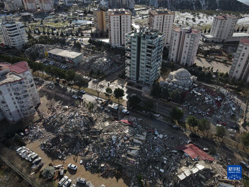 這是2月7日在土耳其南部卡赫拉曼馬拉什市市中心拍攝的震后景象(無人機照片)。卡赫拉曼馬拉什市是本次地震重災(zāi)區(qū)卡赫拉曼馬拉什省省會,是遭受地震破壞最為嚴重的城市之一。