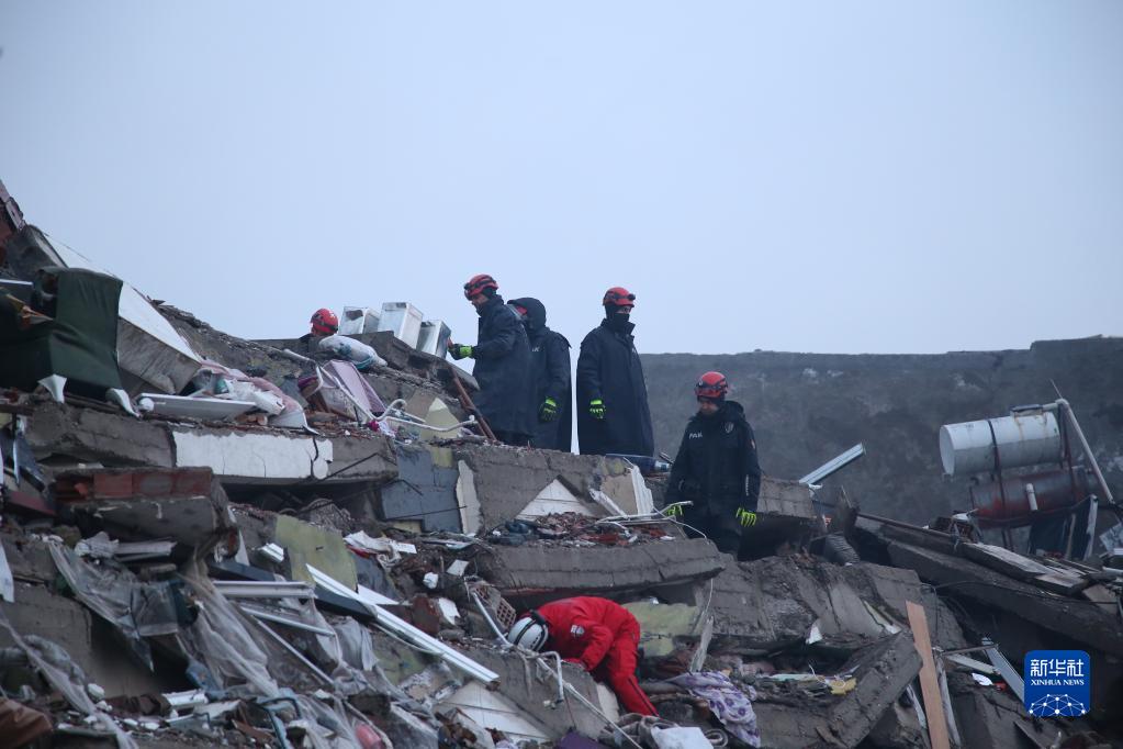 2月7日,在土耳其南部卡赫拉曼馬拉什市市中心,救援人員在搜救。卡赫拉曼馬拉什市是本次地震重災(zāi)區(qū)卡赫拉曼馬拉什省省會,是遭受地震破壞最為嚴重的城市之一。