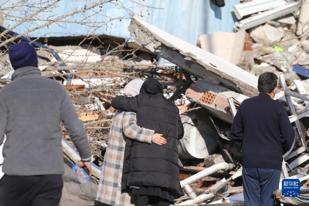 2月7日,災民在土耳其南部卡赫拉曼馬拉什市一處地震廢墟前相互安慰。