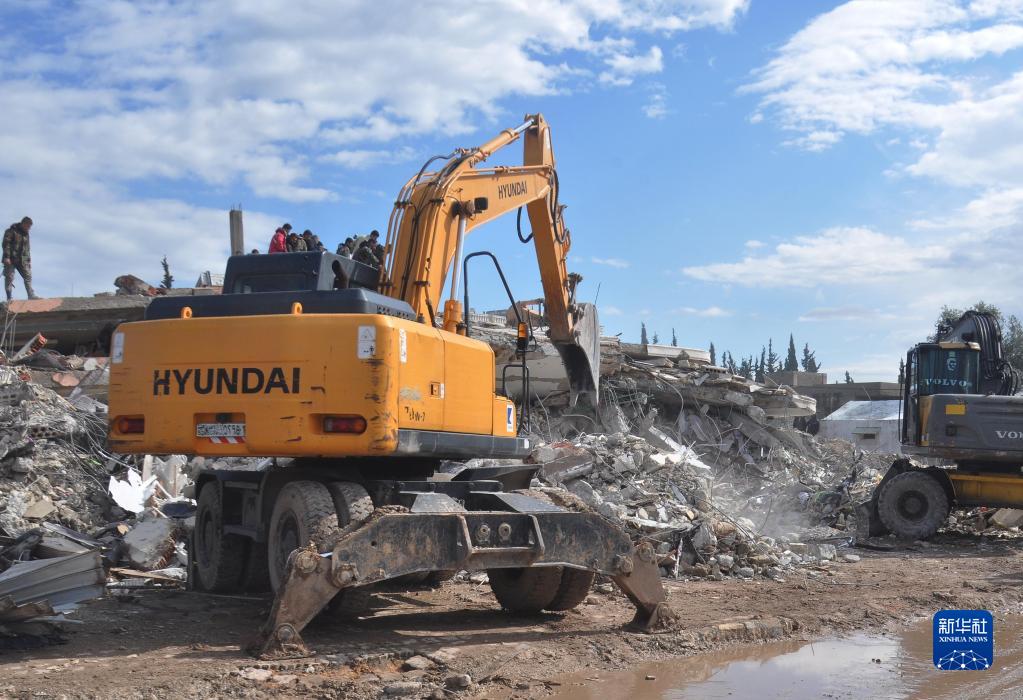 2月7日,人們在敘利亞拉塔基亞省的一處地震廢墟參與搜救。