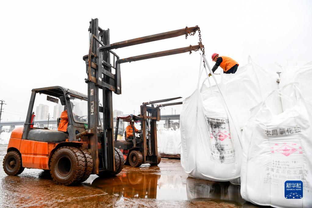 2月7日,江西省宜春西火車(chē)站的工作人員在裝卸化肥。