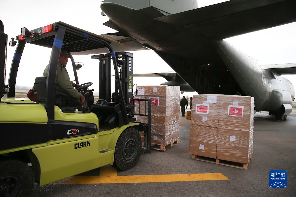2月7日,工作人員在突尼斯迦太基國(guó)際機(jī)場(chǎng)裝載救援物資。突尼斯政府當(dāng)日向土敘兩國(guó)分別派出醫(yī)務(wù)、救援人員并提供救援物資。