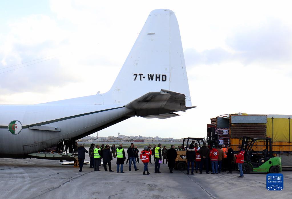 2月7日,在敘利亞阿勒頗國際機場,工作人員卸載阿爾及利亞提供的救援物資。