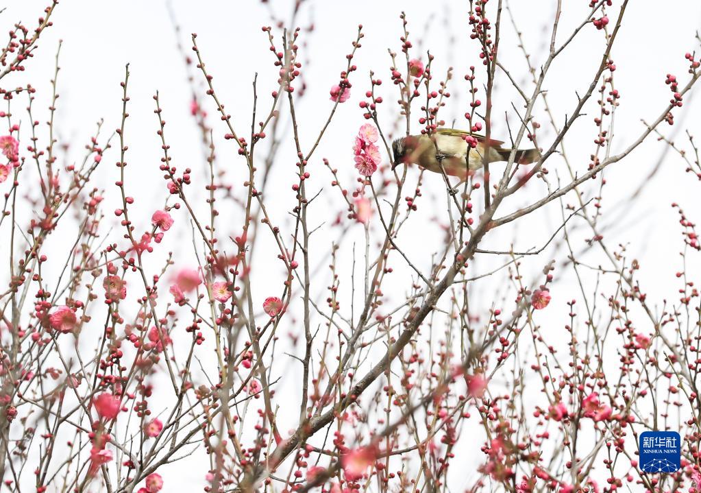 2月8日,在江蘇淮安,白頭鵯在紅梅枝頭棲息。