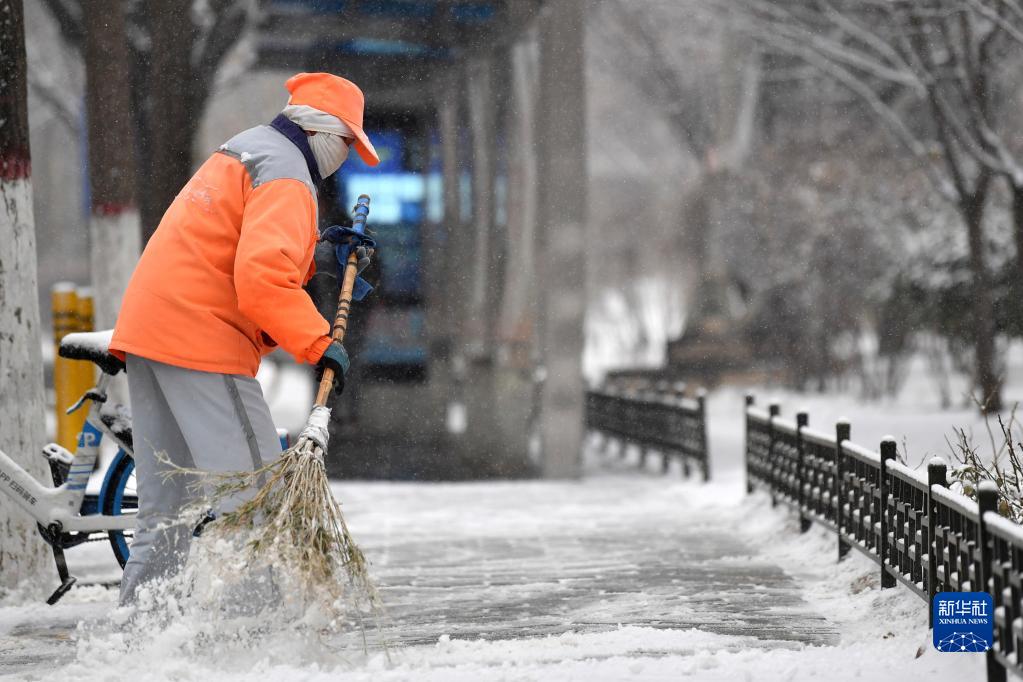 2月8日,環衛人員在蘭州黃河風情線景區清掃人行道積雪。