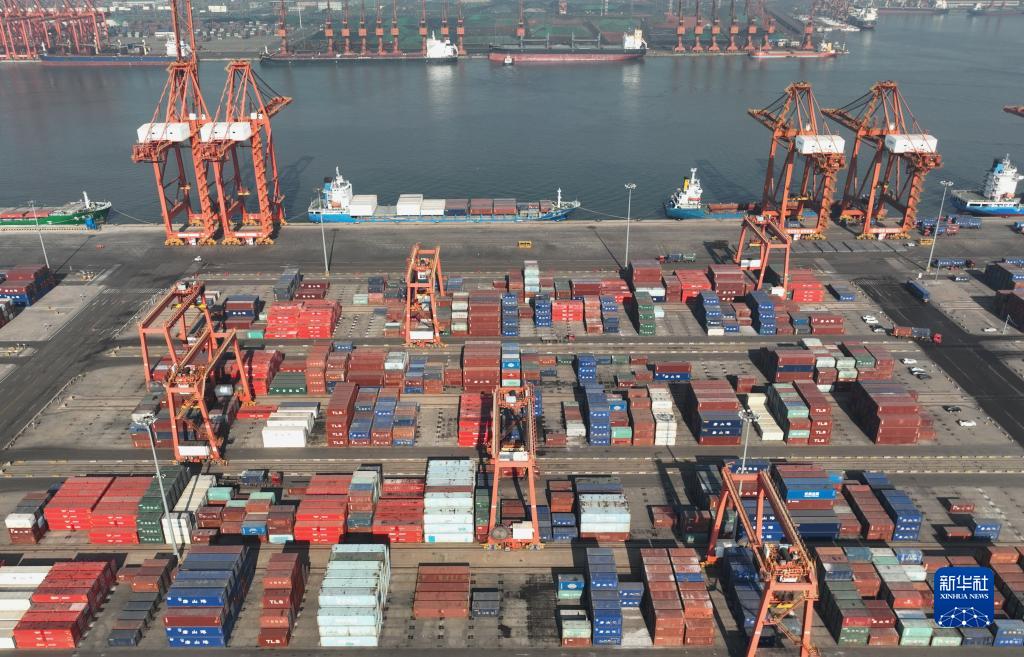 2月8日,輪船靠泊在唐山港京唐港區集裝箱碼頭(無人機照片)。