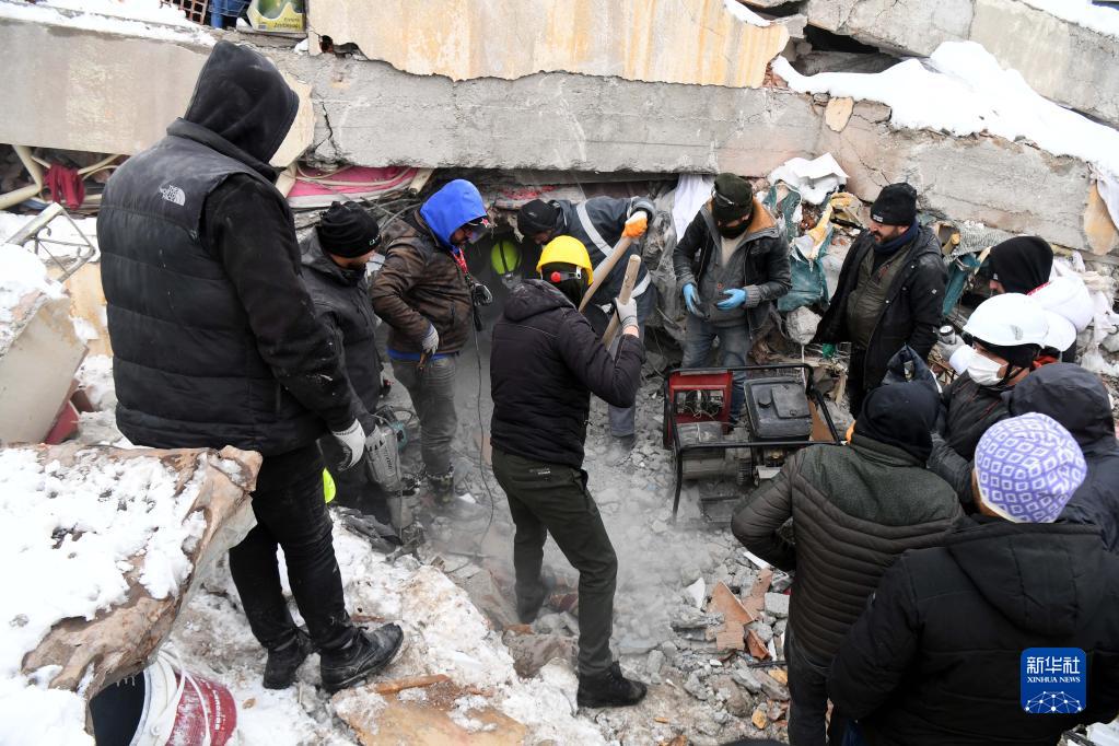 2月7日,在土耳其卡赫拉曼馬拉什省南部的埃爾比斯坦地區,救援人員在一處地震廢墟搜救。