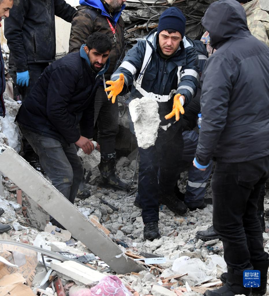 2月7日,在土耳其卡赫拉曼馬拉什省南部的埃爾比斯坦地區(qū),救援人員在一處地震廢墟搜救。