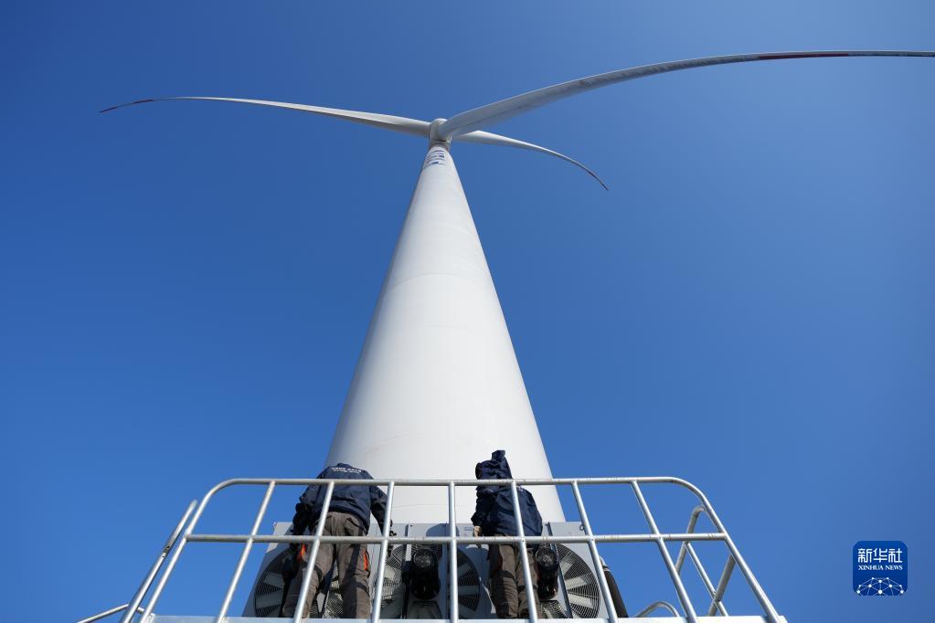 2月7日,在華電黑龍江區(qū)域哈爾濱依蘭雞冠山風(fēng)電場(chǎng)三期工程一處運(yùn)行的風(fēng)電機(jī)組,工作人員在進(jìn)行巡檢。