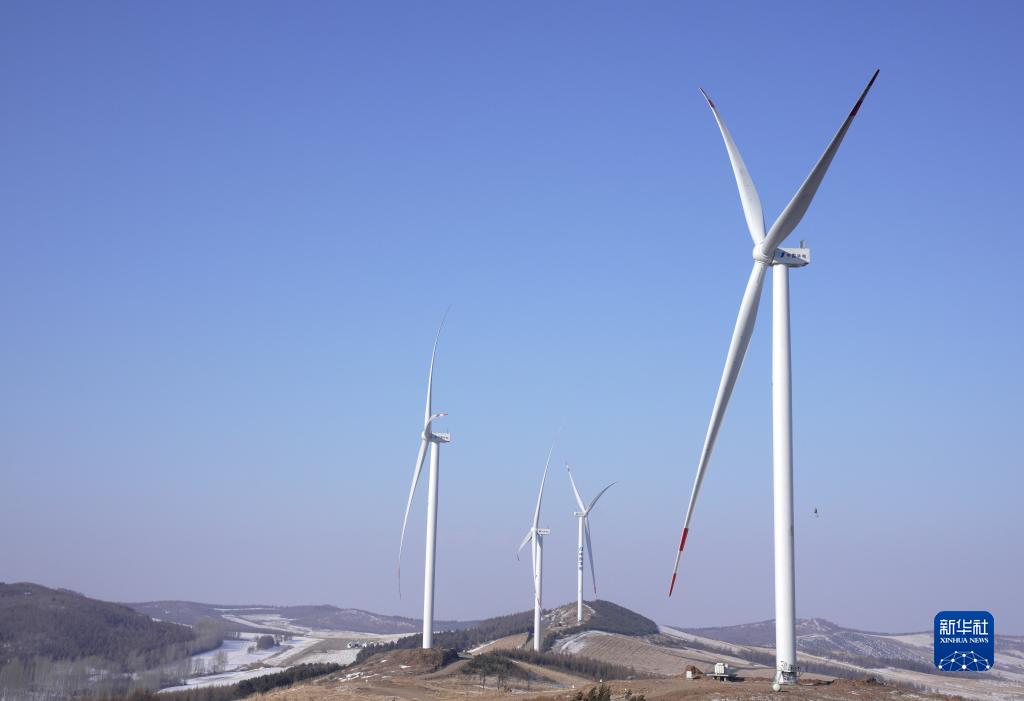 2月7日拍攝的華電黑龍江區域哈爾濱依蘭雞冠山風電場三期工程部分運行的風電機組。