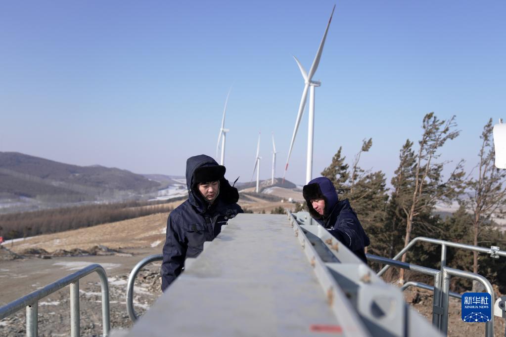 2月7日,在華電黑龍江區(qū)域哈爾濱依蘭雞冠山風(fēng)電場三期工程一處運行的風(fēng)電機組,工作人員在進(jìn)行巡檢。